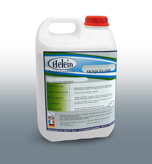 MOQUELIMP es un champú suave biodegradable de acción rápida y profunda, neutro y compensado que no ataca ni daña ningún tipo de fibras naturales ni sintéticas, sino que las protege con sus componentes especiales suavizantes y antiestáticos.